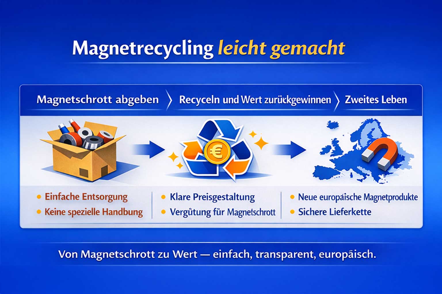 Durch die Wiedereinführung recycelter Seltenerdmaterialien in neue europäische Magnetprodukte trägt das Magnetrecycling zur Versorgungssicherheit bei, reduziert die Abhängigkeit von Primärrohstoffen und fördert eine widerstandsfähigere und nachhaltigere industrielle Lieferkette.